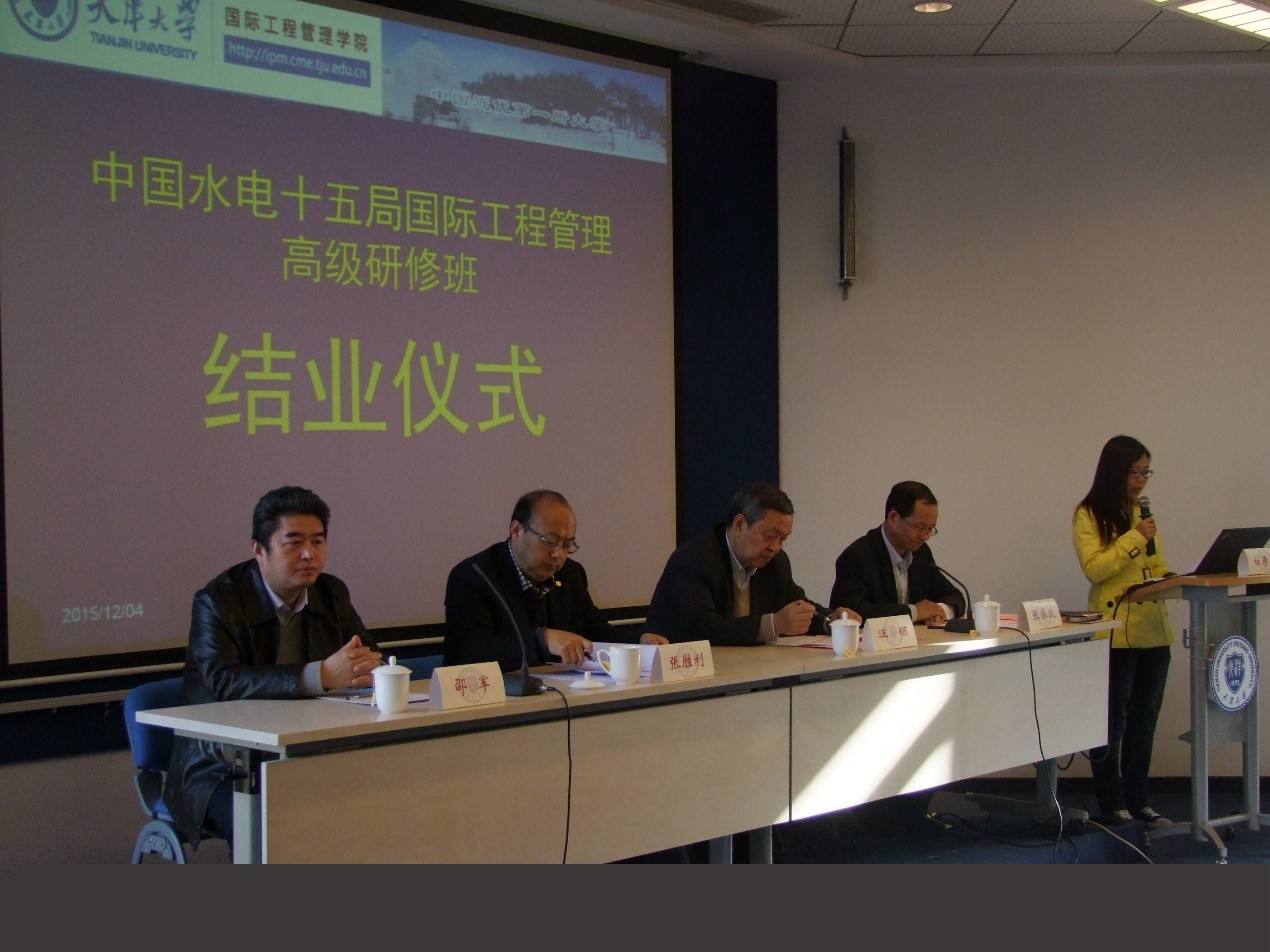2015年12月4日上午,“北京大学—中国水电十五局国际工程管理高级研修班”结业仪式在会议楼第八会议室举行。中国水电十五局副总经理张胜利、总经理助理、人力资源部主任邵军、十五局国际公司副书记、总会计师马利萍、人力资源部主任宋康乐、北京大学党委副书记汪曣、北京大学研究生院高端培训办公室韩旭、北京大学管理与经济学部副主任、国际工程管理学院院长张水波、副院长吕文学出席结业仪式,仪式由国际工程管理学院院长助理白彦壮支持。
