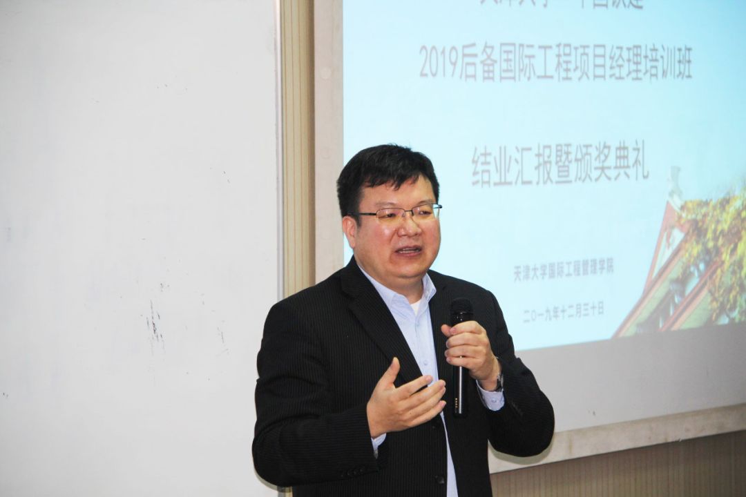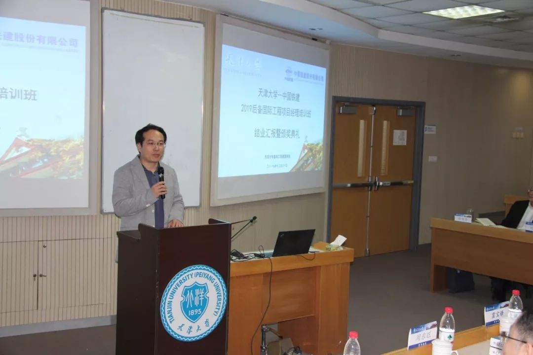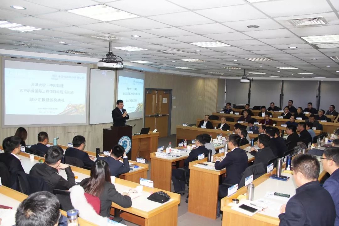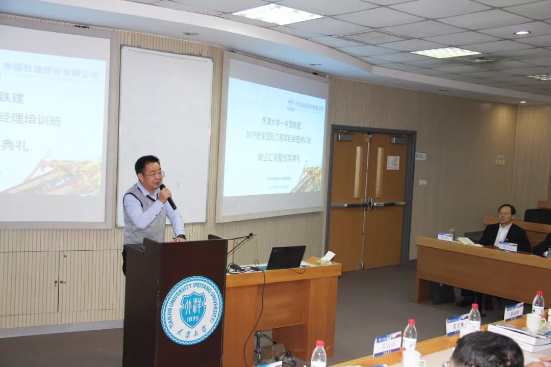 结业典礼在播放纪录片《筑梦——中国铁建海外项目经理黄埔一期》中开始,纪录片回顾了培训班的班级建设、学习分享、结构化研讨、课余活动、学习效果等内容。培训班班长刘火元做班级总结,分享了一个月来在天大的学习体会和感悟收获,班级建设的系列工作和成果,回忆了在天大学习生活的点点滴滴,对股份公司的平台构建和天大教授的教学指导表示了感谢,对各位同学寄予祝福。