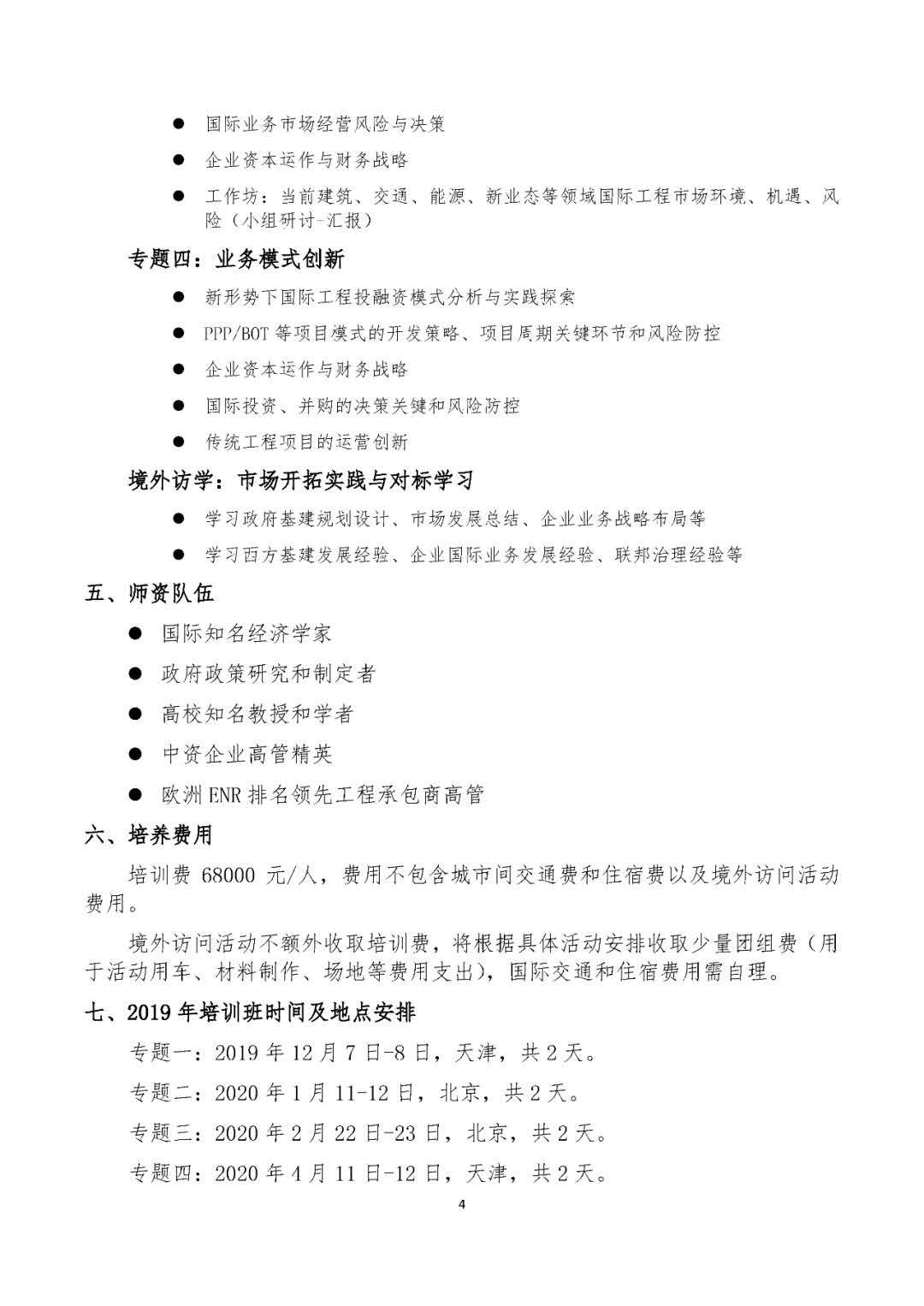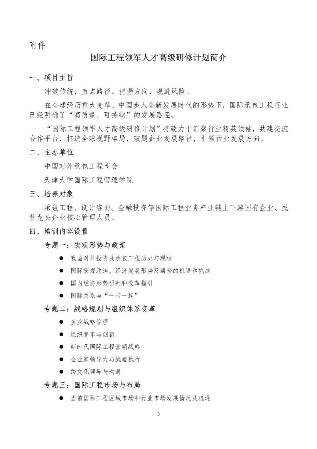 中国对外承包工程商会联合北京市政工程管理学院集结最优势资源,组建一支由知名学家、政策制定者、国际一流学府教授、业内企业精英构成的卓越师资团队,通过视野拓展、理论升级、专题研究、对标学习、海外实践的研修模式,打造国际工程领军人才学习、交流与合作平台,培养一批拥有全球视野和未来格局、洞见跨国经营战略思维、解答企业国际业务转型升级路径、掌握大型项目管理决策能力、具备企业组织管理领导力、执行力和创新力的行业领军队伍。